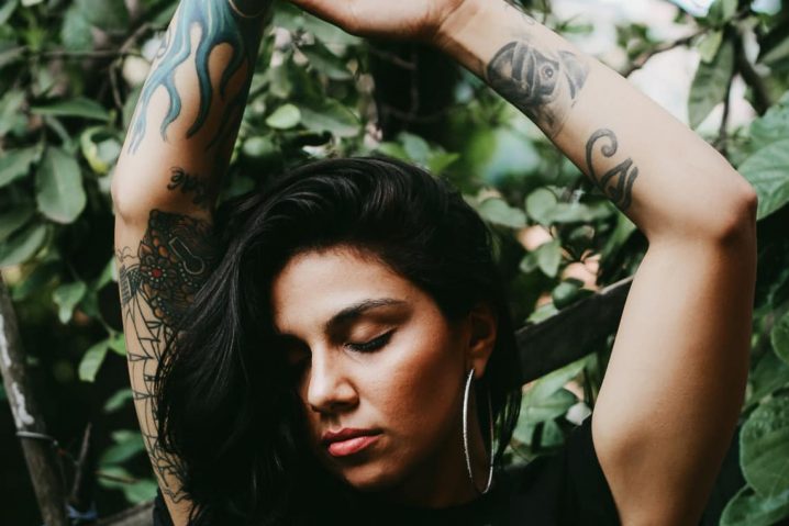 Tattooed Girl With Dark Hair and Black T-Shirt